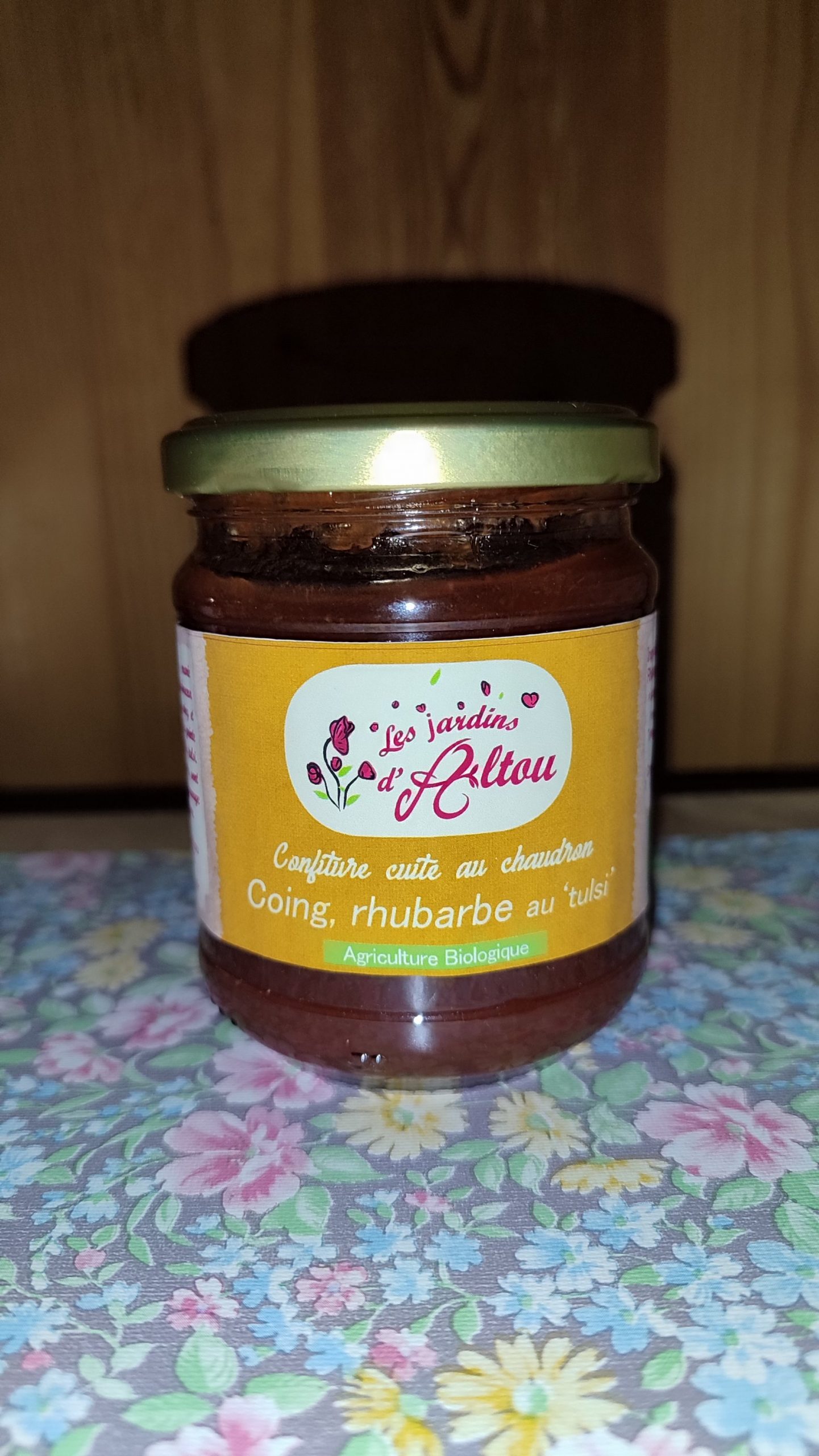 Cette confiture aux notes rondes et gourmande mêle la douceur du coing et de la rhubarbe relevée par la chaleur aromatique du basilic tulsi.